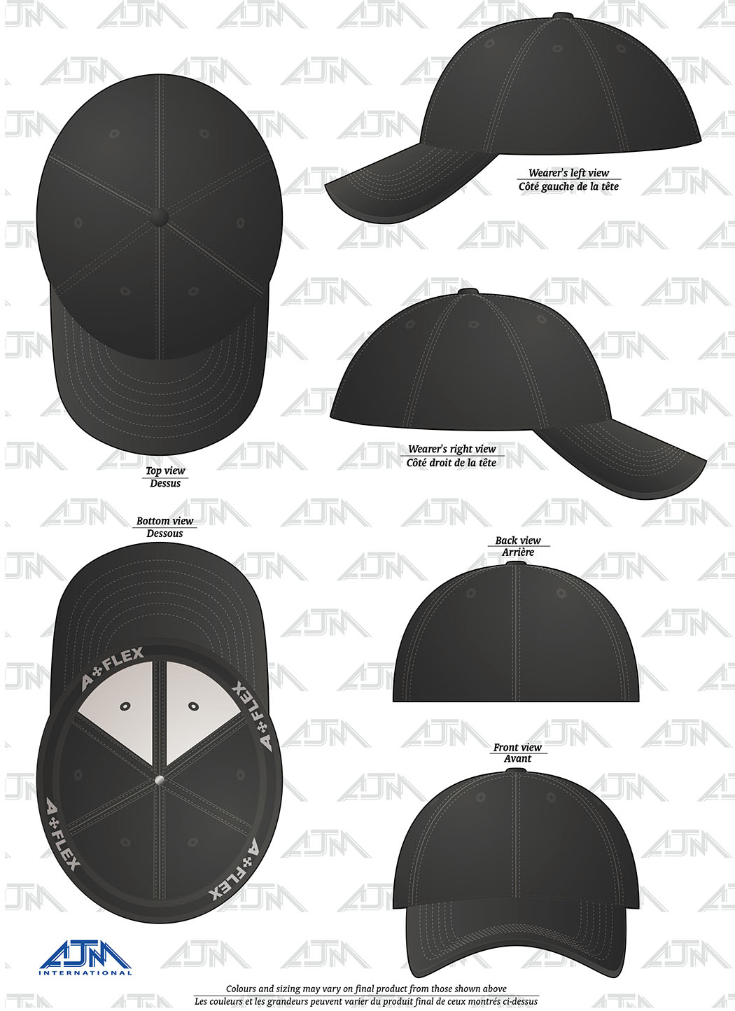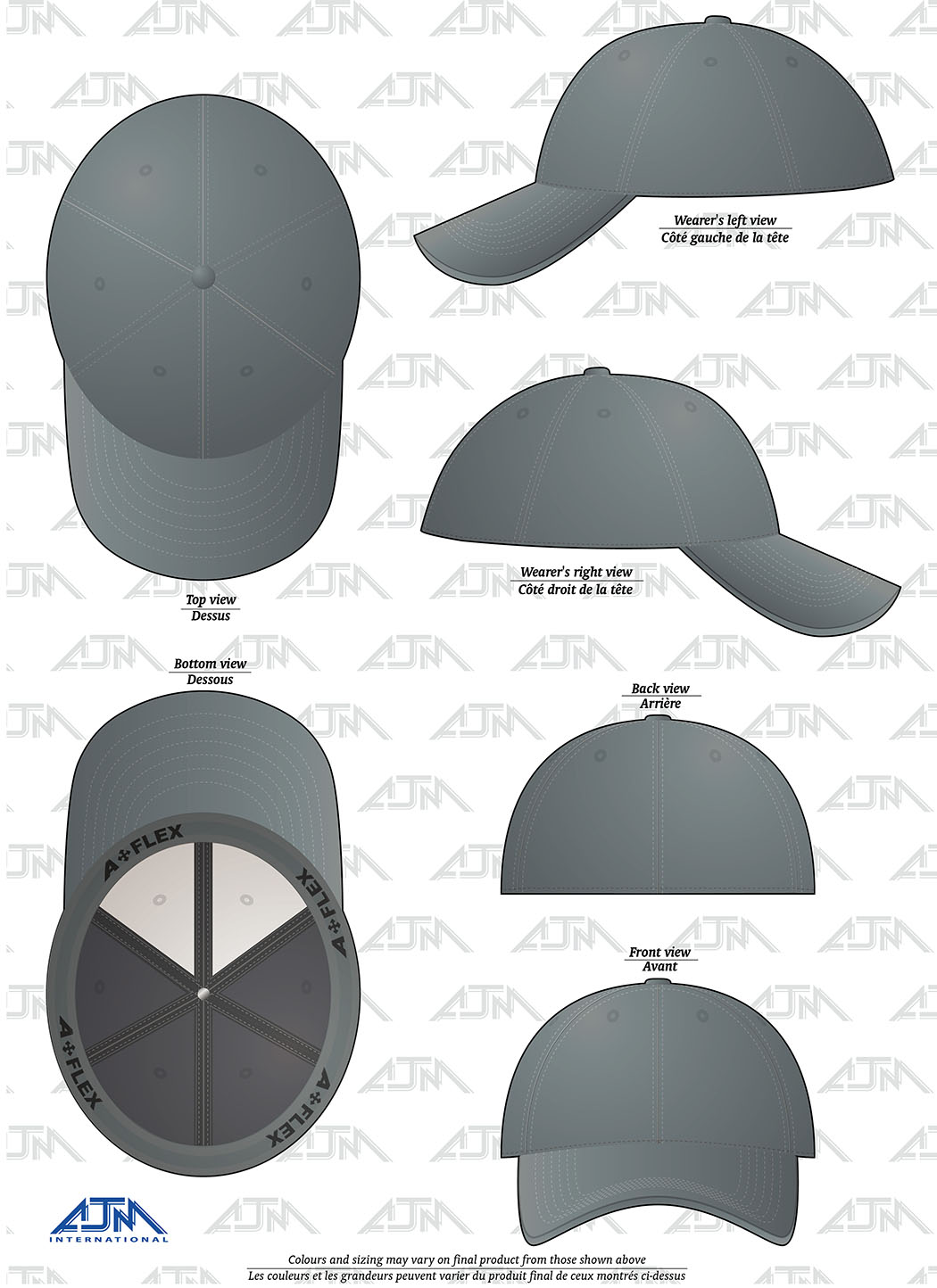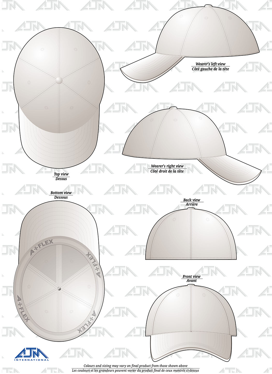 6 panel constructed contour, deluxe buckram laminated front panels with complete pro-stitch, pre-curved pek with 6 rows of stitching, fitted back with elasticized sweatband, hat fits larger than regular.