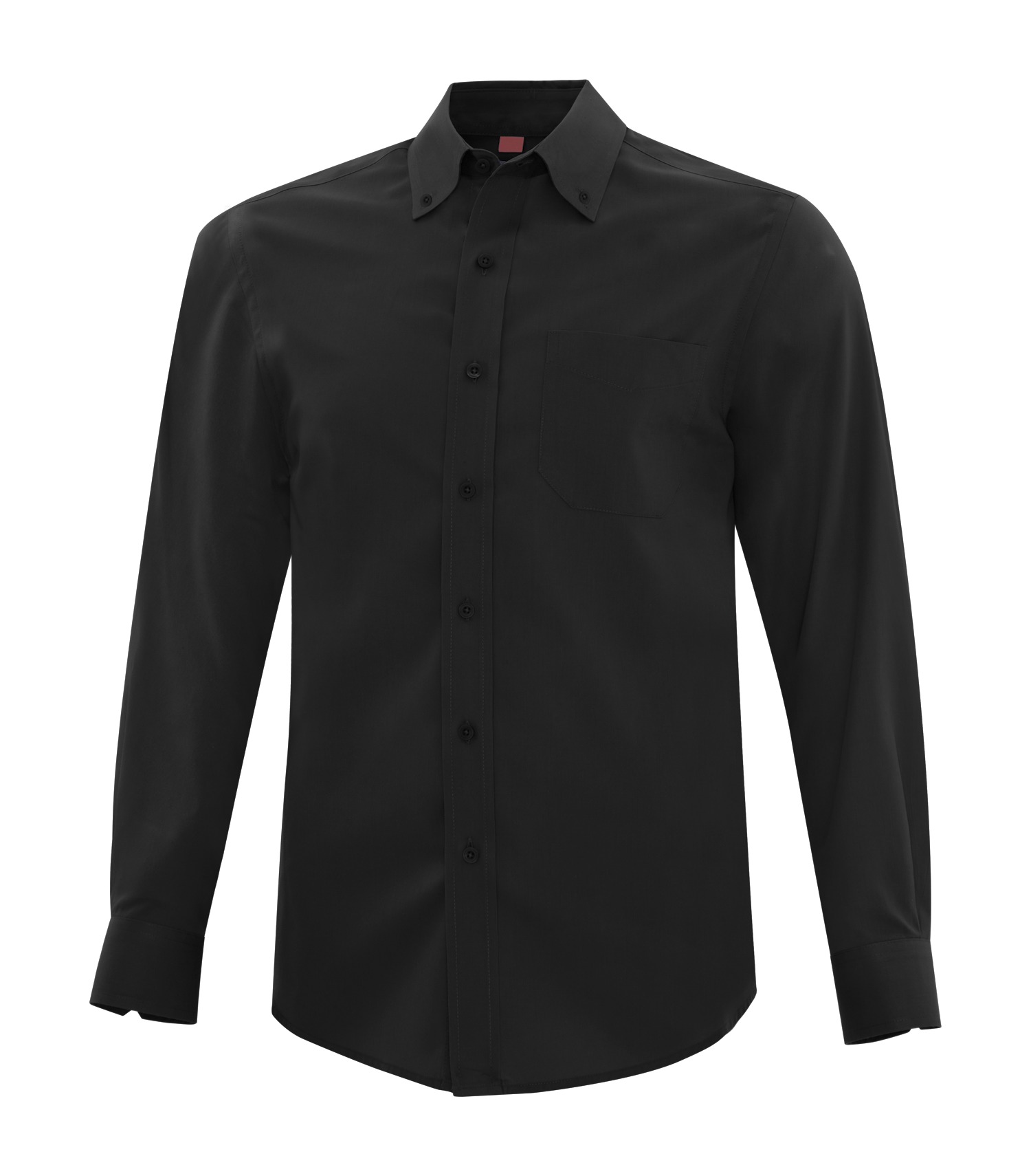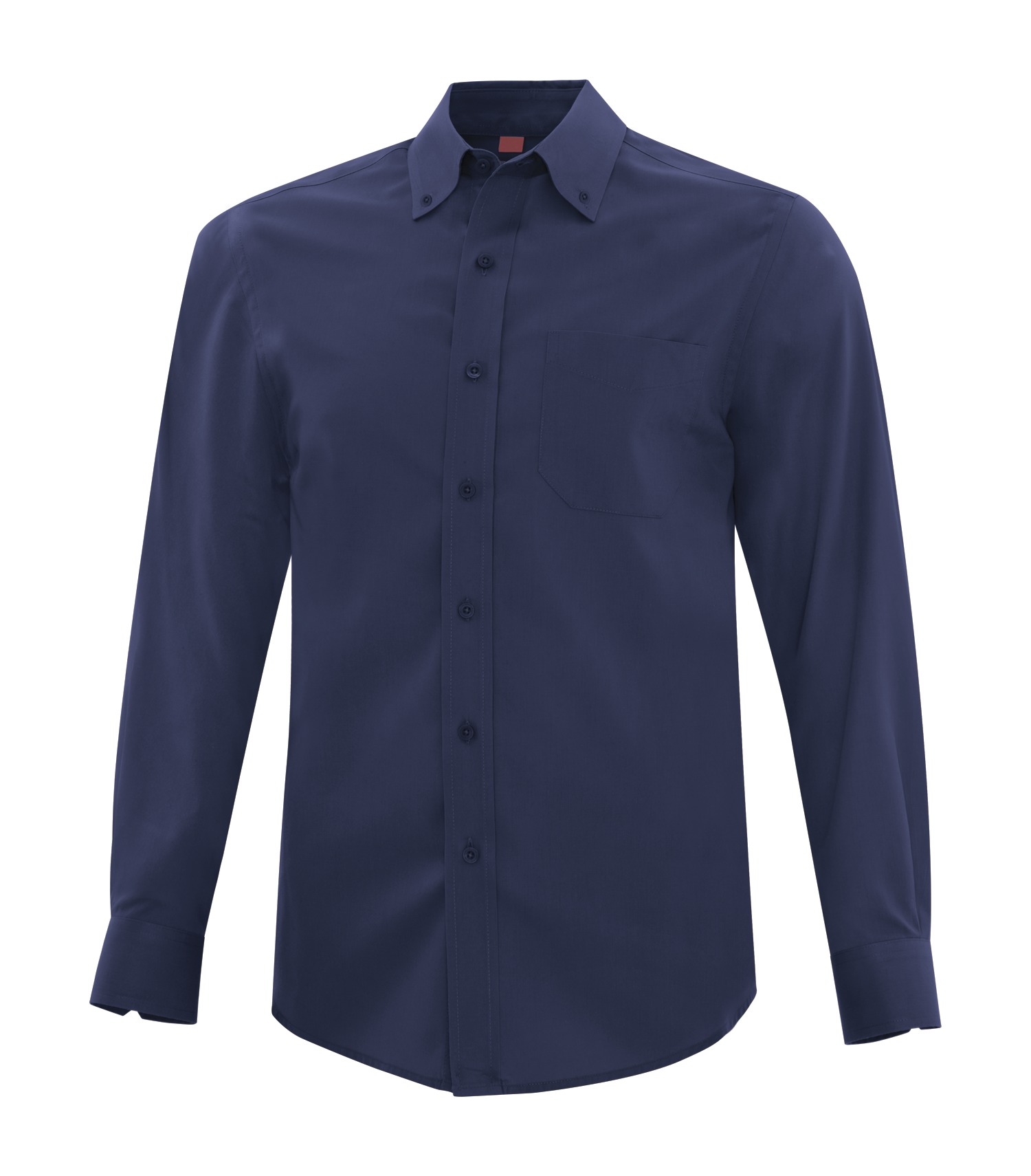 70% Polyester, 30% cotton, wrinkle free. Classic fit, left chest pocket. button down collar