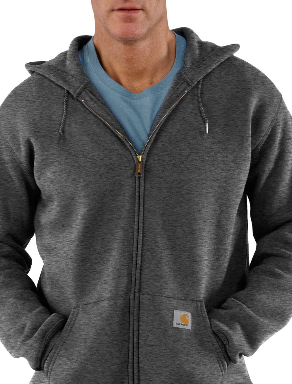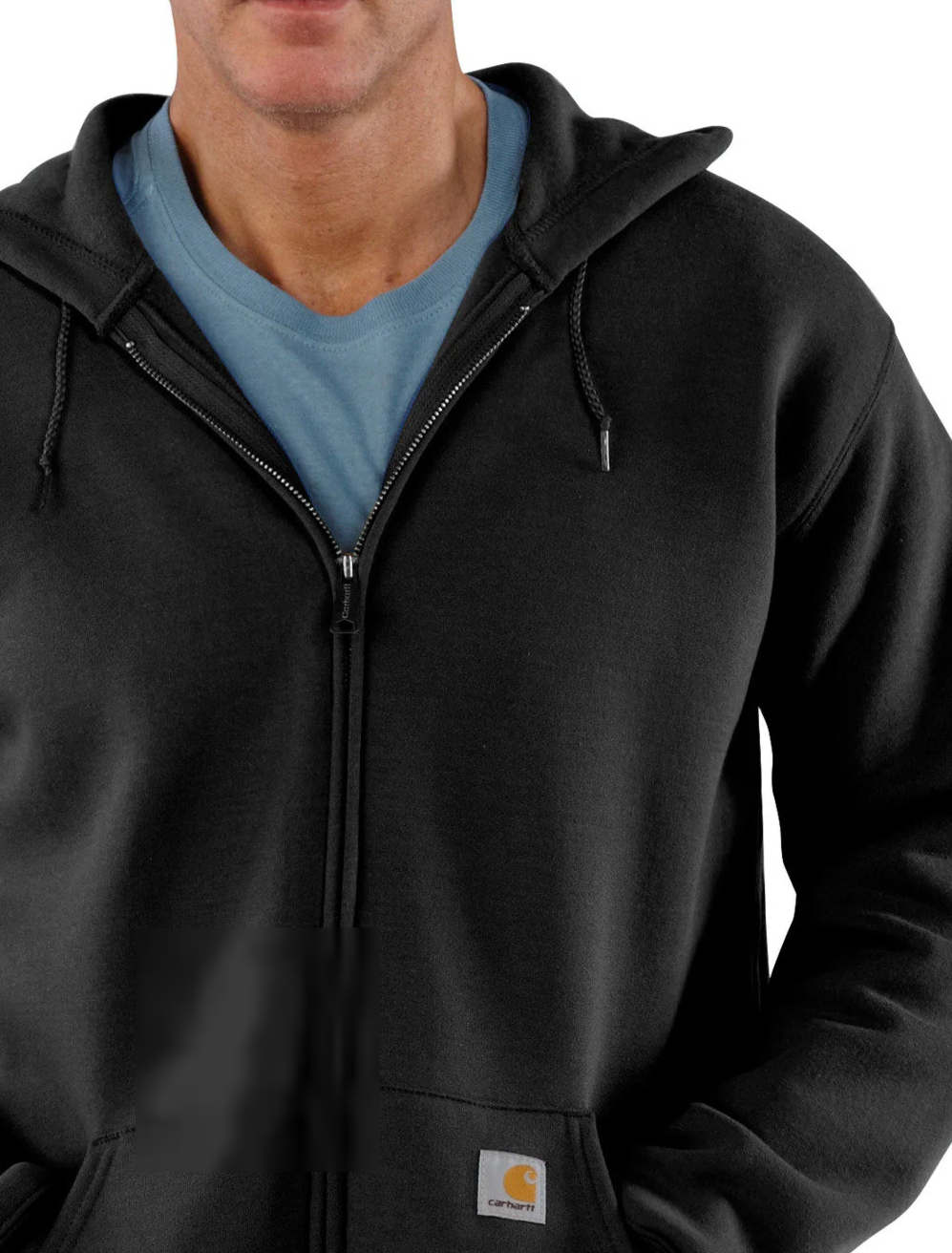 50% polyester, 50% Polyester. Full length brass front zipper. rib knit cuffs and waist. hood with drawcord. 2 pockets.