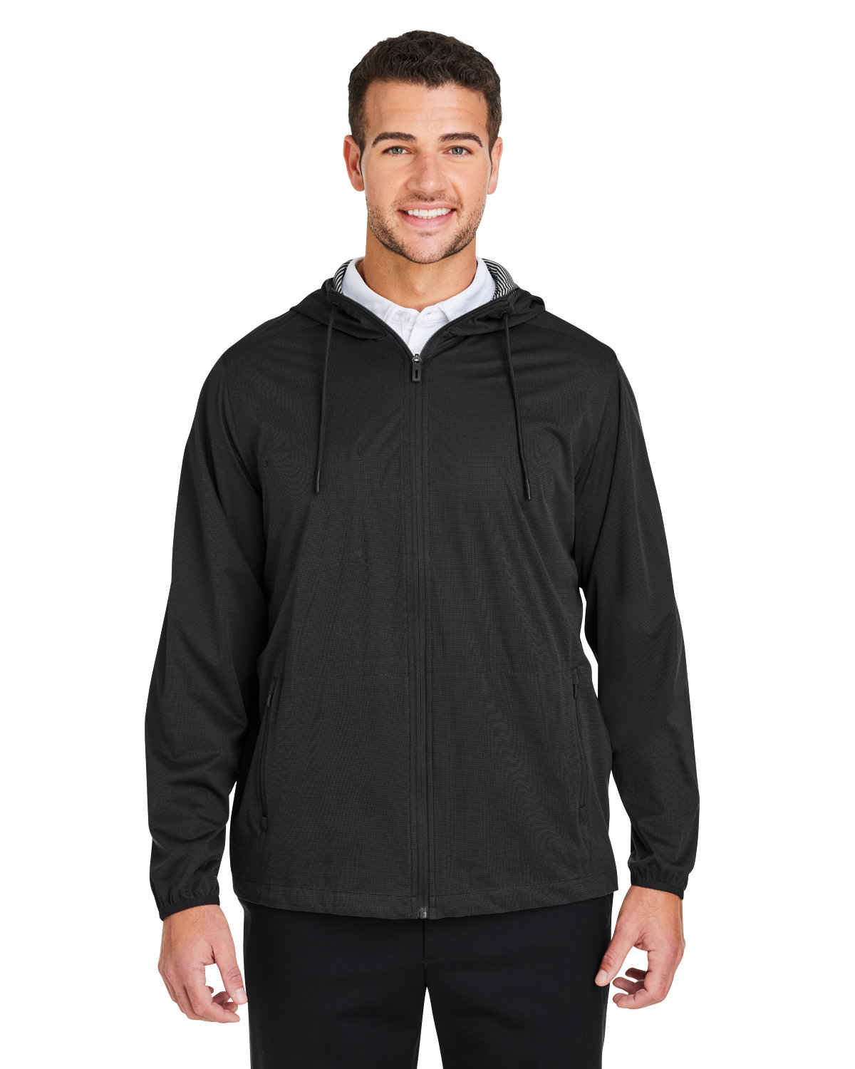 67% Cationic Polyester, 33% poly textured knit. Lining - 95% Polyester, 5% spandex. Breathable, waterproof, drawcord at hood.