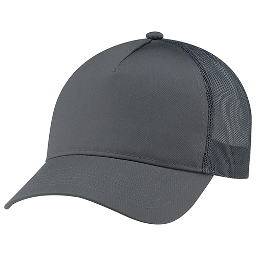 Polycotton/Nylon Mesh. 5 panel constructed full fit five with mesh back. Pre-curved peak with 6 rows of stitching. Ponytail opening between 2 back sections. Plastic adjustable back strap.