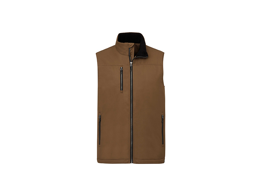 100% Polyester, Polyester sherpa fleece lining. Zippered chest and side pockets.