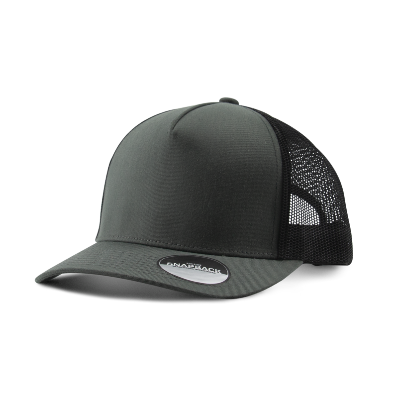 5 panel trucker hat with premium mesh back. Mid profile. Structured. Snapback closure.